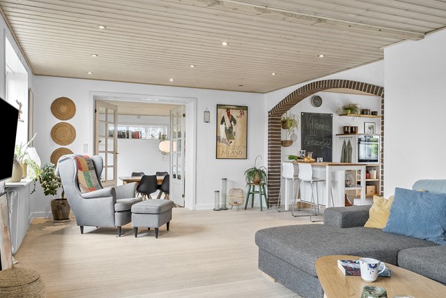 Træder du gennem den dobbelte franske dør, har du den nedsænkede spisestue, og dermed får du god plads til at være sammen. Herfra er der udgang til den hævede træterrasse. Bevæger du dig op på 1. salen, har du et værelse og et stort soveværelse.