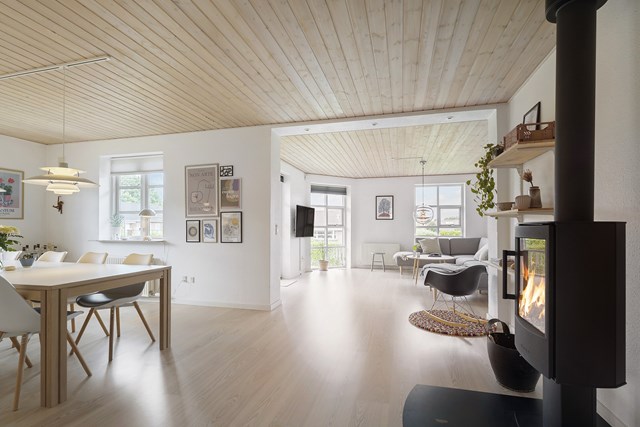 De velindrettede 164 m² er fordelt i ét plan på en funktionel planløsning. I forbindelse med entréen, hvor du bydes velkommen, har du et badeværelse og et soveværelse. Videre træder du ind i den store spise- og opholdsstue med rig plads til hyggelige timer omkring brændeovnen. Fra stuen har du udgang til én af terrasserne.